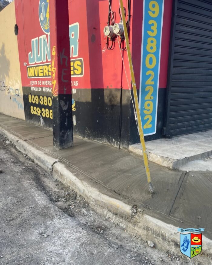 Villa Sombrero, Peravia. – La Junta Municipal de Villa Sombrero continúa avanzando de manera satisfactoria en los trabajos de construcción de aceras y contenes que se ejecutan en diferentes sectores de la comunidad, como parte del plan integral de mejoramiento de la infraestructura urbana.