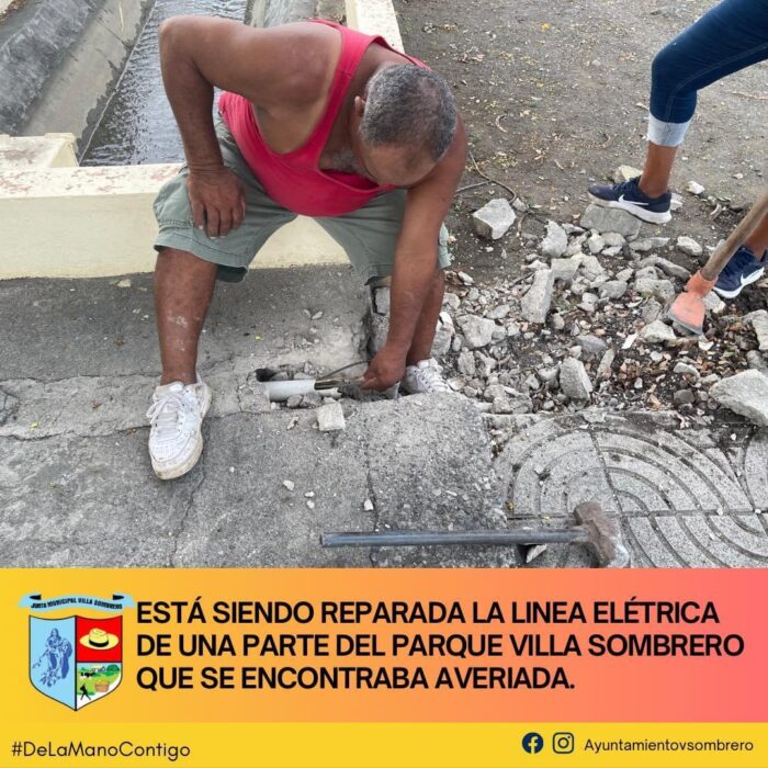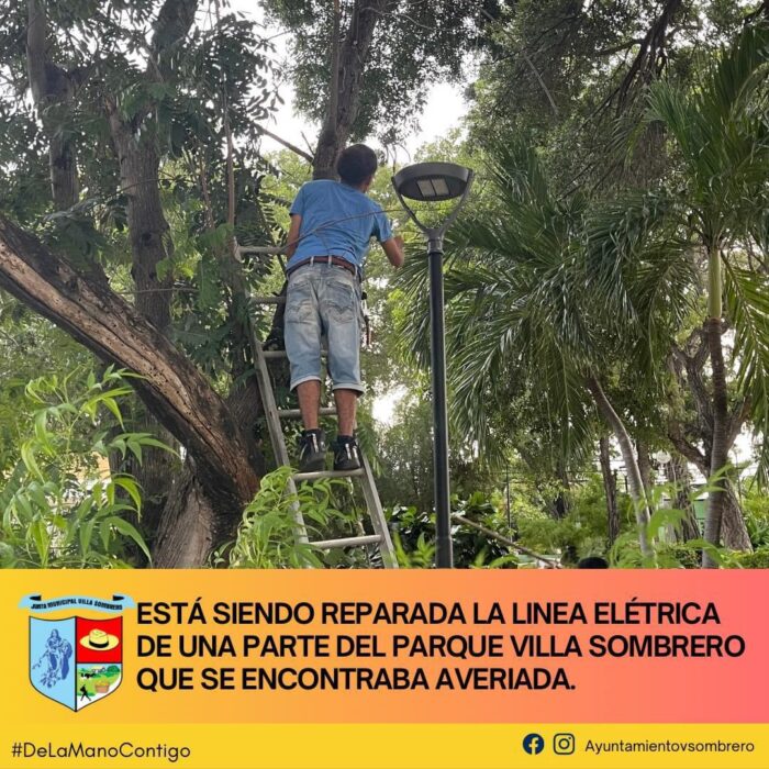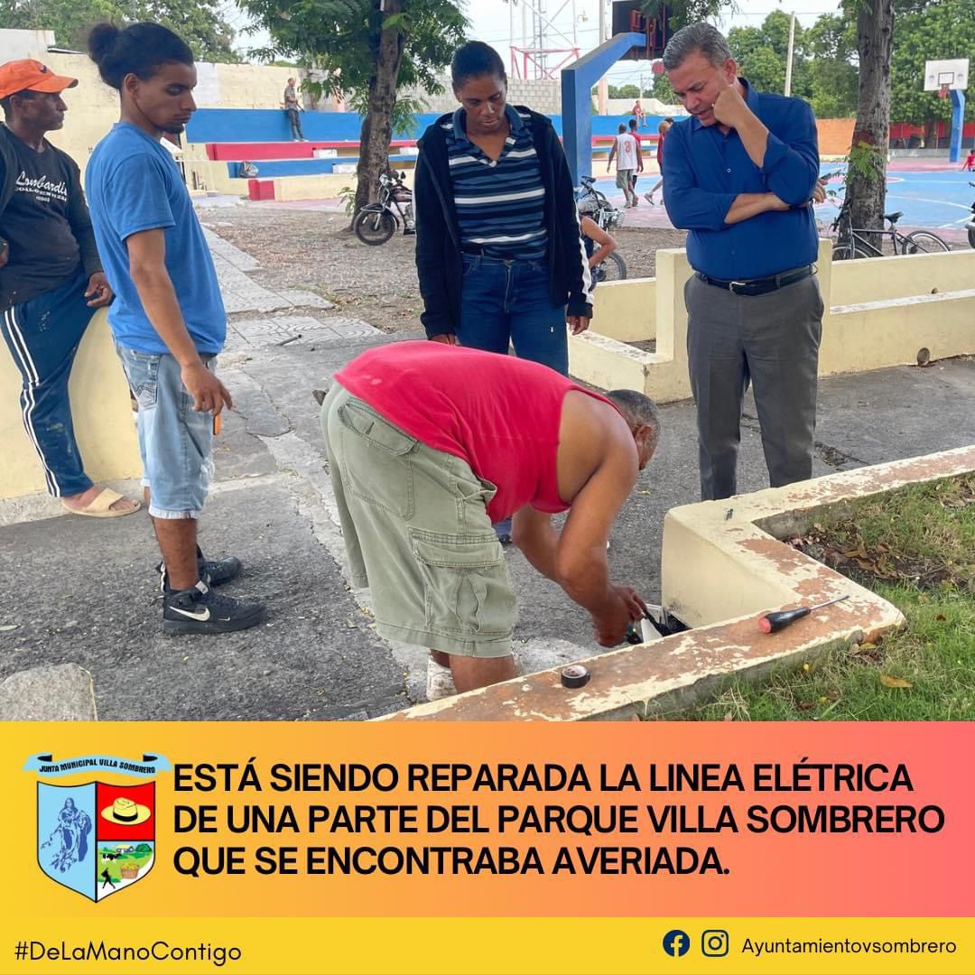 La Junta Municipal de Villa Sombrero se complace en informar que los trabajos de reparación de la línea eléctrica en una sección del Parque de Villa Sombrero, previamente afectada por una avería, ya están en marcha. Nuestro compromiso es garantizar que los espacios públicos se mantengan en óptimas condiciones para el disfrute y bienestar de toda la comunidad.