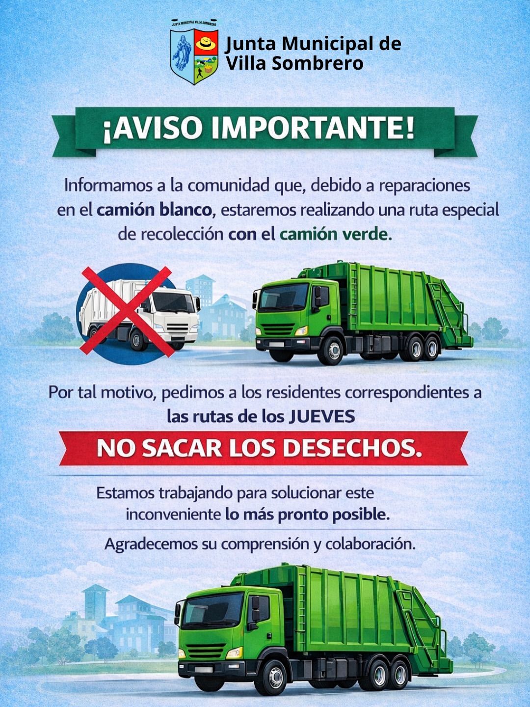 Informamos a la comunidad que, debido a reparaciones en el camión blanco, estaremos realizando una ruta especial de recolección con el camión verde.