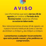 14 agosto, 2024Les informamos que este viernes 16 agosto por motivo al feriado de la Restauración, nuestras oficinas no estarán laborando. Nos...
