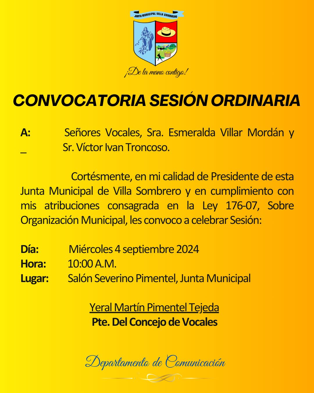 Cortésmente, en mi calidad de Presidente de esta Junta Municipal de Villa Sombrero y en cumplimiento con las atribuciones consagradas en la Ley 176-07, Sobre Organización Municipal, les convoco a una sesión ordinaria que se llevará a cabo el miércoles 04 de septiembre del 2024 a las 10:00am en el salón de sesiones de esta Junta Municipal.