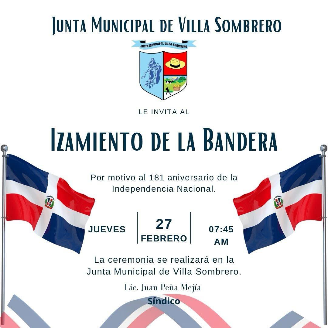 La Junta Municipal de Villa Sombrero invita a toda la comunidad a participar en el solemne Izamiento de la Bandera Nacional, un acto de honor y patriotismo en conmemoración de nuestras gloriosas gestas independentistas.