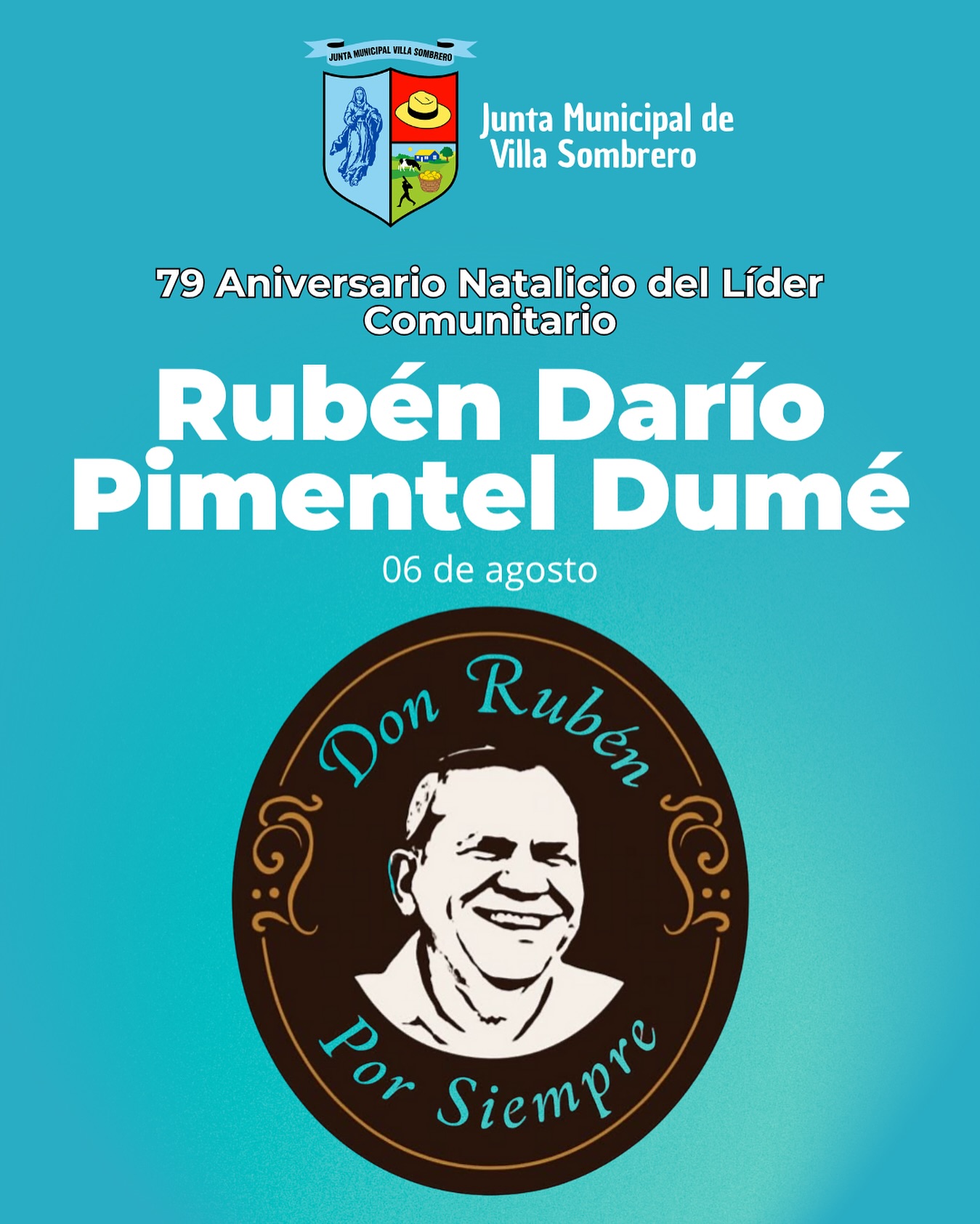 Hoy recordamos el 79 aniversario del natalicio de Rubén Darío Pimentel Dumé, destacado líder comunitario de Villa Sombrero, cuya entrega, visión y compromiso social dejaron una huella imborrable en nuestra comunidad.