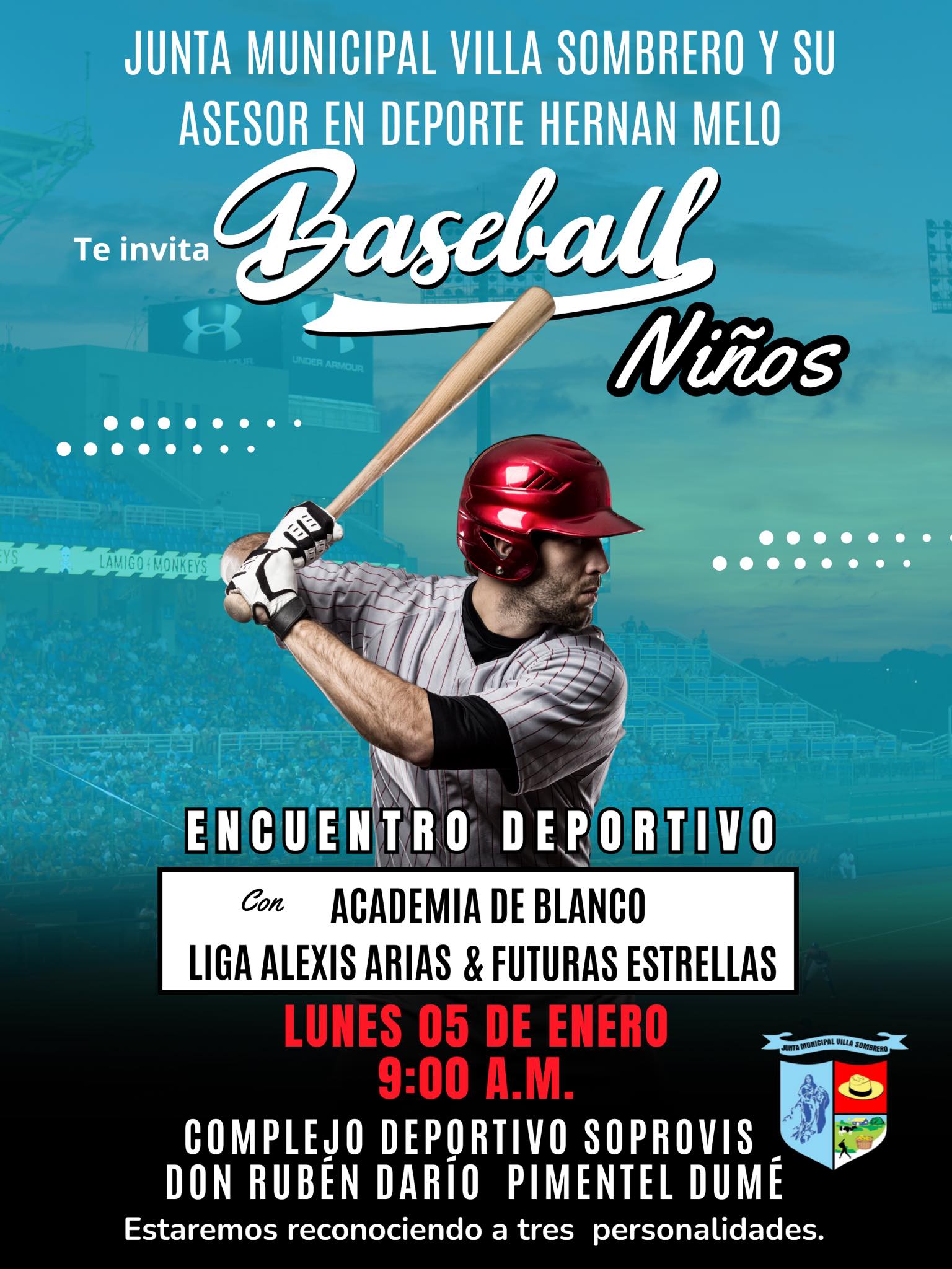 La Junta Municipal de Villa Sombrero, junto a su asesor en deporte Hernán Melo, invita a todos los niños a disfrutar de un emocionante Encuentro Deportivo de Béisbol, junto a la Academia de Blanco, Liga Alexis Arias y Futuras Estrellas.