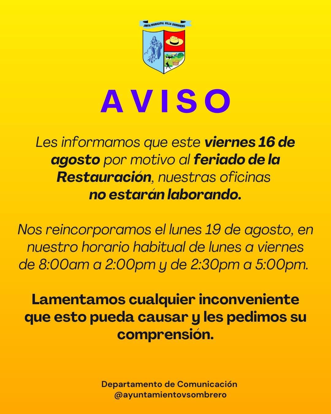 Les informamos que este viernes 16 agosto por motivo al feriado de la Restauración, nuestras oficinas no estarán laborando.