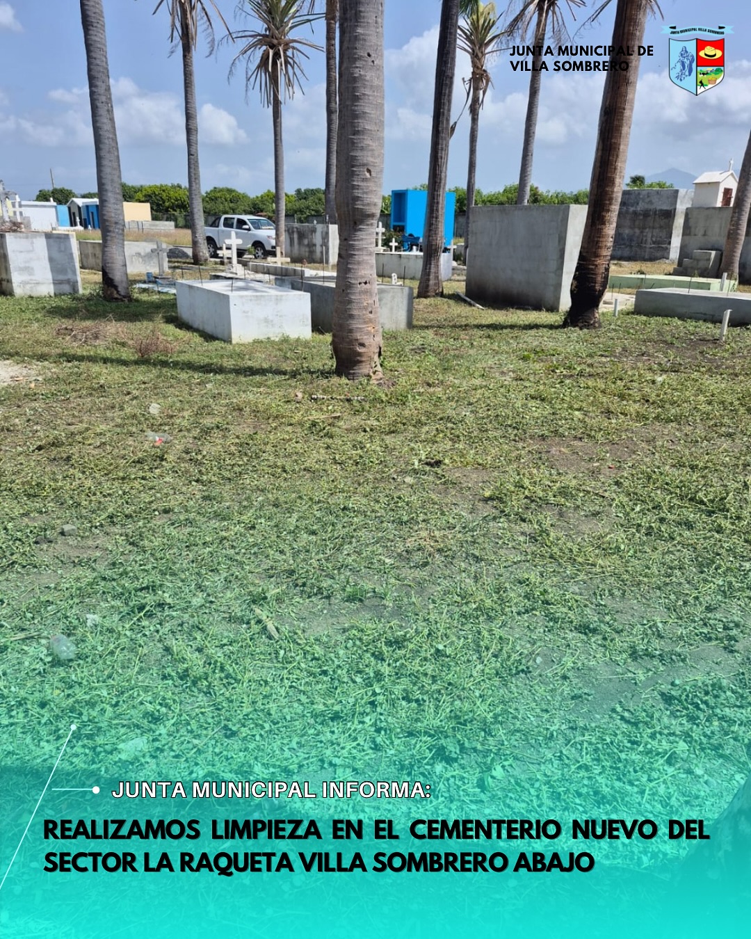 Como parte de nuestro compromiso con el orden, la limpieza y el respeto a los espacios comunitarios, la Junta Municipal de Villa Sombrero realizó una jornada de limpieza y acondicionamiento en el cementerio nuevo del sector La Raqueta.