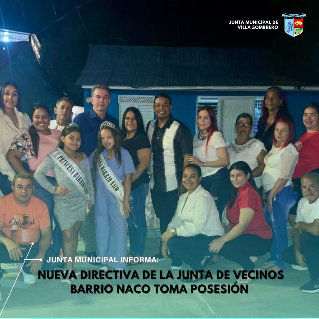 Villa Sombrero – La Junta Municipal de Villa Sombrero felicita a la Junta de Vecinos del sector Barrio Naco por la reciente juramentación de su nueva directiva, encabezada por el Sr. Alinson Estepan, quien asume el compromiso de liderar esta organización comunitaria.