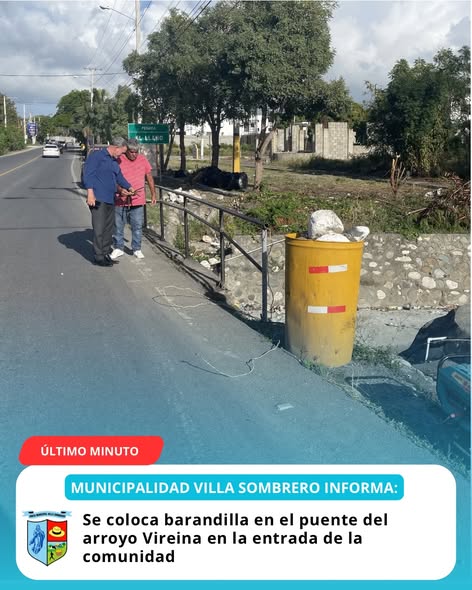 La Junta Municipal de Villa Sombrero dejó instalada una barandilla en el puente del arroyo Vireina, ubicado en la entrada de la comunidad, como parte de los trabajos orientados a fortalecer la seguridad vial y peatonal en la zona.