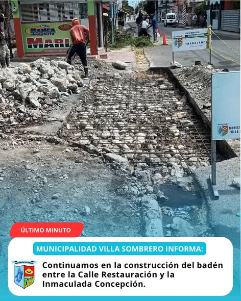 Villa Sombrero, Baní. – La Junta Municipal de Villa Sombrero continúa avanzando en los trabajos de construcción de un badén en la intersección de las calles Restauración e Inmaculada Concepción, como parte de las acciones que buscan mejorar el drenaje pluvial y la seguridad vial en esa zona.
