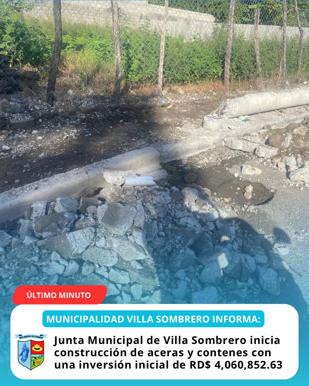 La Junta Municipal de Villa Sombrero dio inicio a la primera etapa del proyecto de construcción de aceras y contenes en la comunidad, con una inversión inicial de RD$ 4,060,852.63. Los trabajos comenzaron en el Barrio Villa Luz, marcando el inicio de un plan de intervención que abarcará progresivamente todos los sectores del distrito municipal.