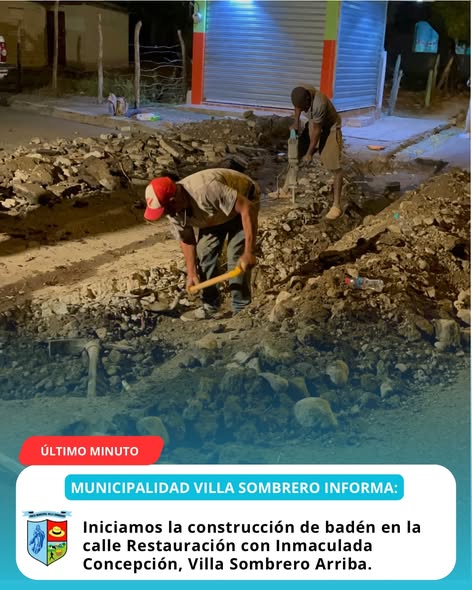 Villa Sombrero.– La Junta Municipal de Villa Sombrero dio inicio a los trabajos de construcción de un badén en la intersección de las calles Restauración e Inmaculada Concepción, en el sector Villa Sombrero Arriba.