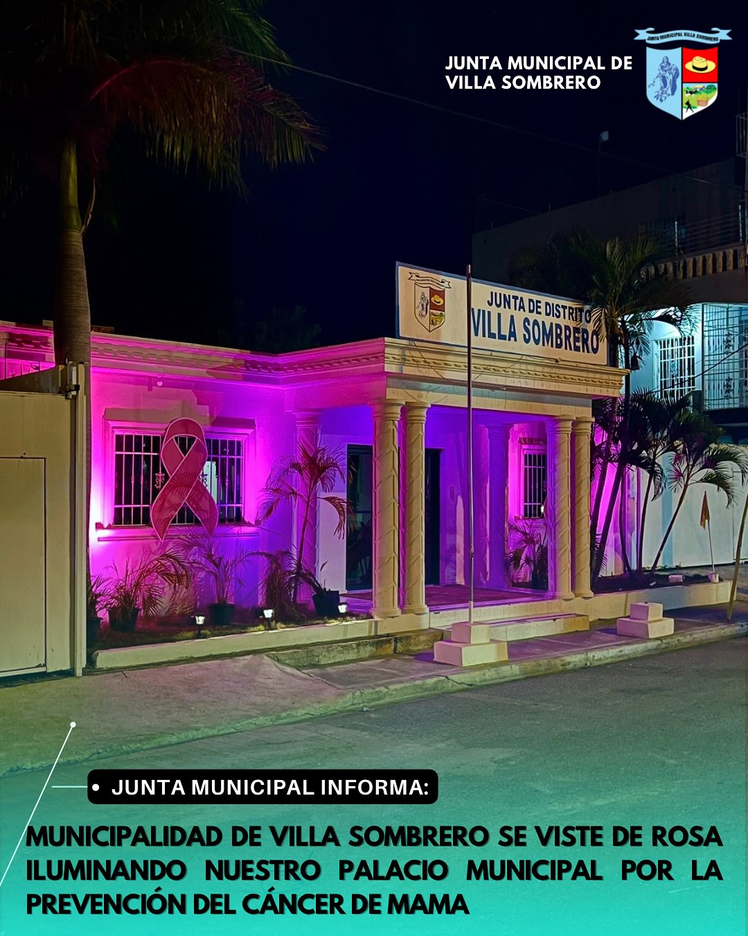 Por segundo año consecutivo, la Junta Municipal de Villa Sombrero se une a la conmemoración del Mes de la Prevención del Cáncer de Mama, iluminando de color rosa su palacio municipal como símbolo de apoyo y esperanza hacia todas las mujeres que luchan contra esta enfermedad.