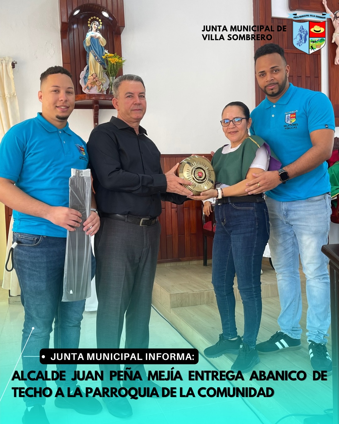 Con el objetivo de responder a la necesidad de sustituir el abanico dañado por uno nuevo, el alcalde del Distrito Municipal de Villa Sombrero, Lic. Juan Peña Mejía, realizó la entrega de un abanico de techo KDK a la parroquia de la comunidad.