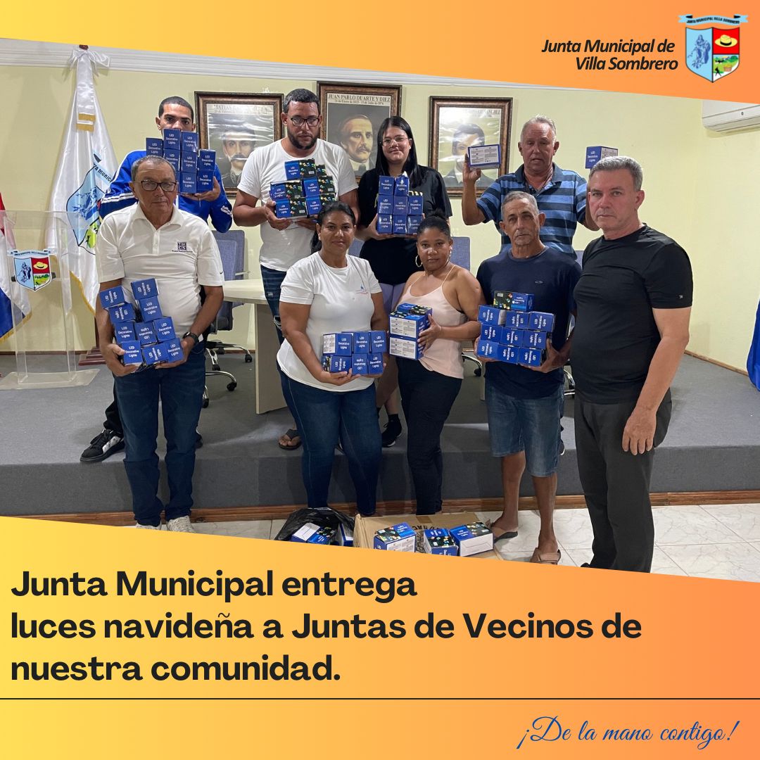 La Junta Municipal de Villa Sombrero, dirigida por el alcalde Lic. Juan Peña Mejía, realizó la entrega de luces navideñas a las Juntas de Vecinos de diferentes sectores de la comunidad, en un gesto que busca embellecer los espacios públicos y fomentar el espíritu navideño entre los residentes.