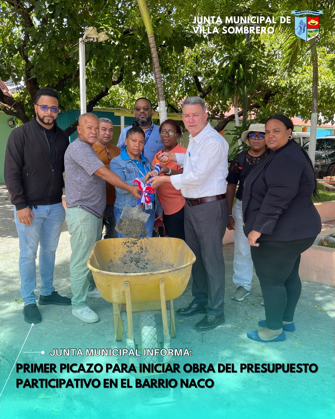 Con la presencia del director distrital, Lic. Juan Peña Mejía, y la presidenta del Concejo de Vocales, Sra. Esmeralda Villar, la Junta Municipal de Villa Sombrero realizó el primer picazo que marca el inicio formal de la obra contemplada en el Presupuesto Participativo 2025 para el Barrio Naco.
