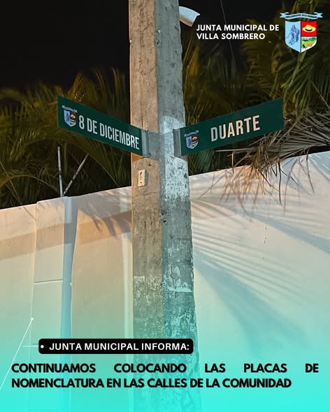 Villa Sombrero, Baní. – La Junta Municipal de Villa Sombrero continúa con los trabajos de instalación de placas de nomenclatura en diferentes calles de la comunidad, con el objetivo de mejorar la identificación vial y contribuir al ordenamiento urbano del Distrito Municipal.