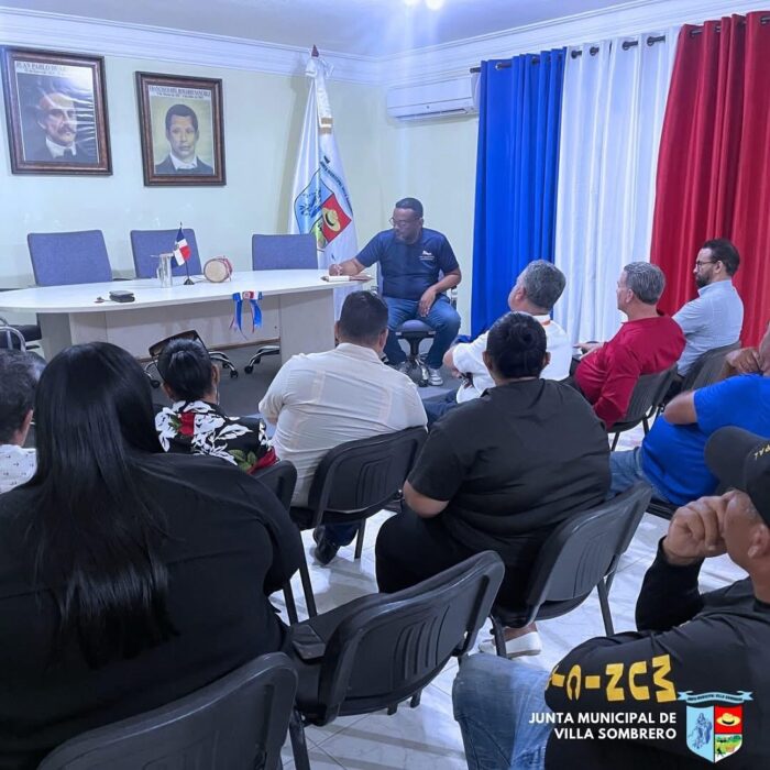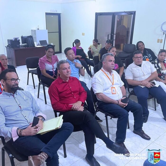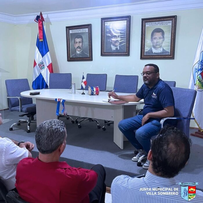 El alcalde de Villa Sombrero, Lic. Juan Peña Mejía, junto a la vicepresidenta de la Sala Capitular, Sra. Esmeralda Villar, el Edil Junior Troncoso y el equipo administrativo, sostuvieron un encuentro con el Lic. Manuel Peña, Coordinador de Control Interno Municipal de la Liga Municipal Dominicana.