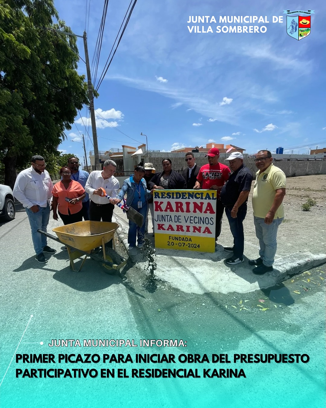 Con la presencia del director distrital, Lic. Juan Peña Mejía, y la presidenta del Concejo de Vocales, Sra. Esmeralda Villar, la Junta Municipal de Villa Sombrero realizó el primer picazo que marca el inicio formal de la obra contemplada en el Presupuesto Participativo 2025 para el Residencial Karina.