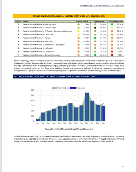 Al cierre del segundo trimestre de 2025, la Junta Municipal de Villa Sombrero se posiciona en el 1er lugar del Ranking General, 1er lugar en el SISMAP Servicios y 1er lugar en la Región Valdesia.