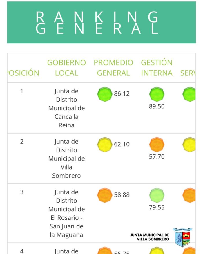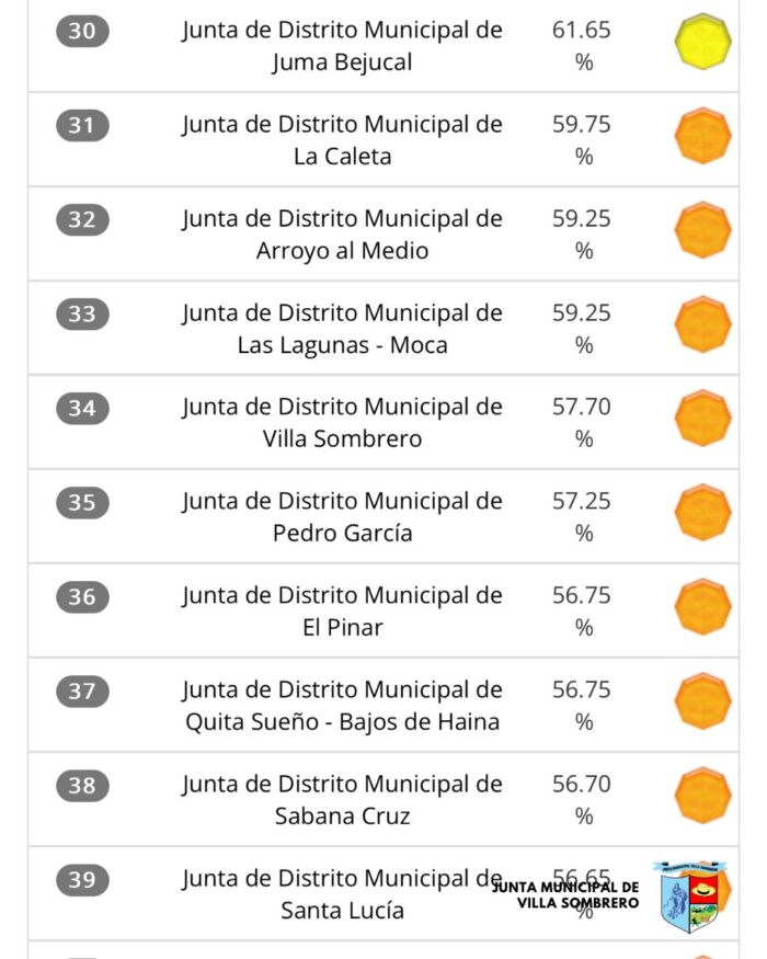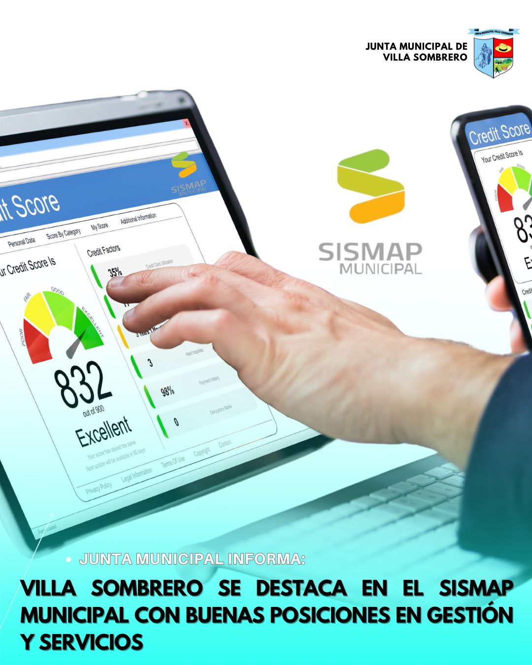 El alcalde municipal, Lic. Juan Peña Mejía, anunció con entusiasmo los resultados de la Junta Municipal de Villa Sombrero en el Sistema de Monitoreo de la Administración Pública Municipal (SISMAP Municipal). Informó que la institución se posicionó en el lugar NO. 2 de (42) Juntas Municipales evaluados en Promedio General, en Servicios ocupamos la posición NO. 2 con el 66.50% y en gestión interna (normas) en el puesto número 34 de 235 Juntas Municipales evaluados.